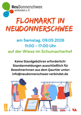 Von 11:00 bis 17:00 Uhr findet auf der Wiese im Schumacherhof unser bunter Quartiers-Flohmarkt statt.