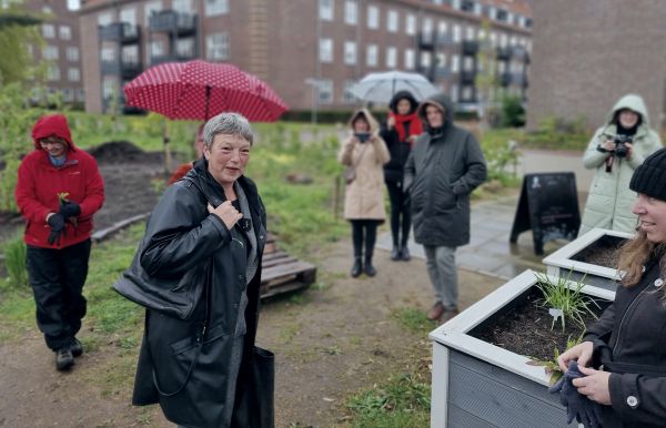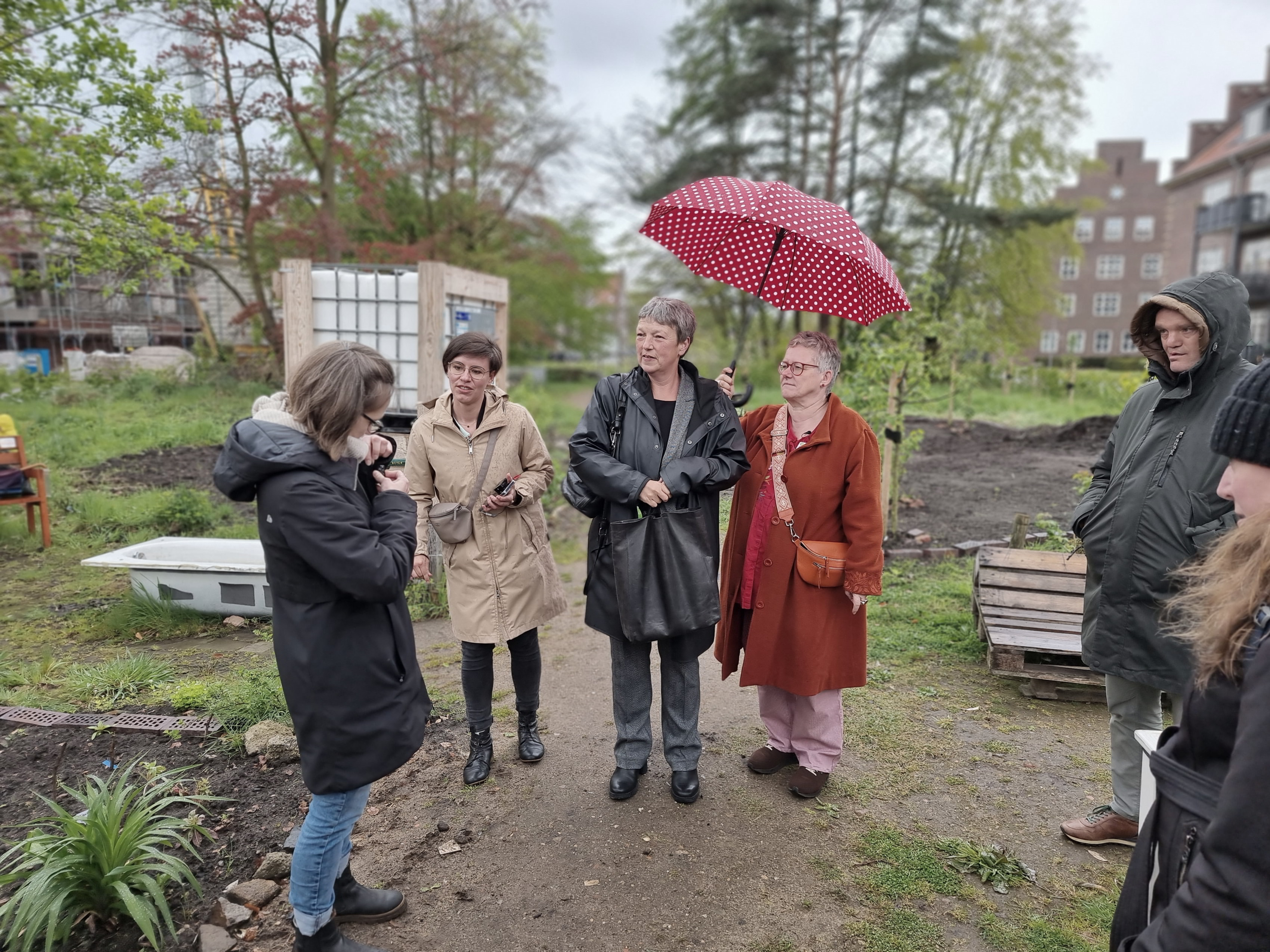 Im Quartiersgarten Donnernessel harrten trotz Regen einige fleißige GärtnerInnen aus und haben über die guten Möglichkeiten berichtet, in unserem Garten so viel ehrenamtliche Mitarbeit einzubringen, wie die persönliche Situation gerade zulässt. Nachdem sie die Kunde vernommen hatten, dass Frau Naber im Garten zu sprechen ist, kam eine große Gruppe von Gärtnerinnen durch den Regen dazu und hat gezeigt, wie viele Menschen aktiv bei uns dabei sind.
