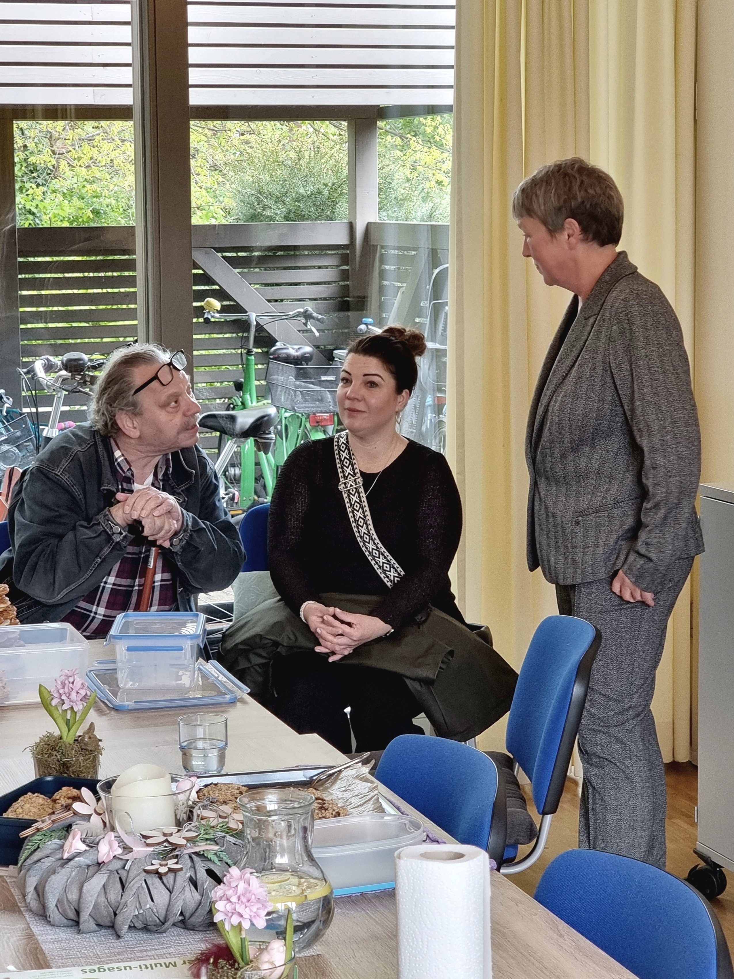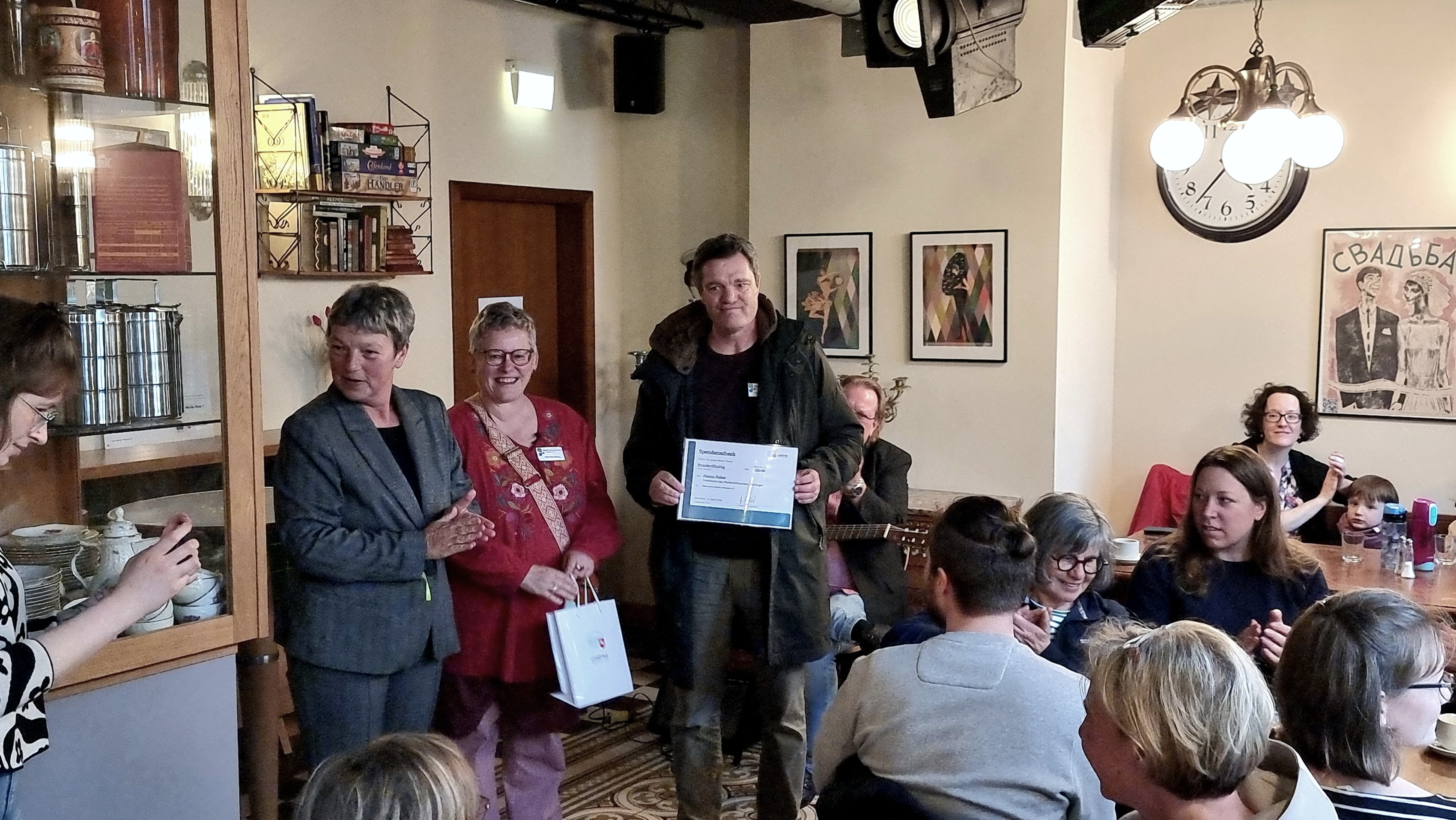 Schließlich haben wir in den Räumen der Jugendkulturarbeit den Nachmittag ausklingen lassen. Der frische Kuchen und die Kekse wurden per Lastenfahrrad ins Café gefahren. Dort wurde Kaffee und Tee von erfahrenen Ehrenamtlichen gekocht und wir durften uns an live gespielter Gitarrenmusik erfreuen. Diese Musik wurde besonders von drei beatmeten Patienten mitsamt ihrer Pflegerinnen genossen. Ein kleines Konzert ganz nah, auch dies ein besonderes Erlebnis für gelebte Inklusion vor Ort. Unsere Landtagspräsidentin hat sich abschließend bei uns bedankt und gesagt, dass wir als gutes Beispiel für Demokratie im Land Niedersachsen zusammen wirken. Zu unserer großen Überraschung bekamen wir auch noch einen Scheck überreicht und ein „Tochterbild“ vom Landtag, verbunden mit der Einladung, dass große „ Mutterbild“ bei Frau Naber im Büro zu besuchen. Wir danken Frau Naber ganz herzlich für den Besuch und die Zeit für die vielen netten Gespräche mit unseren Ehrenamtlichen !