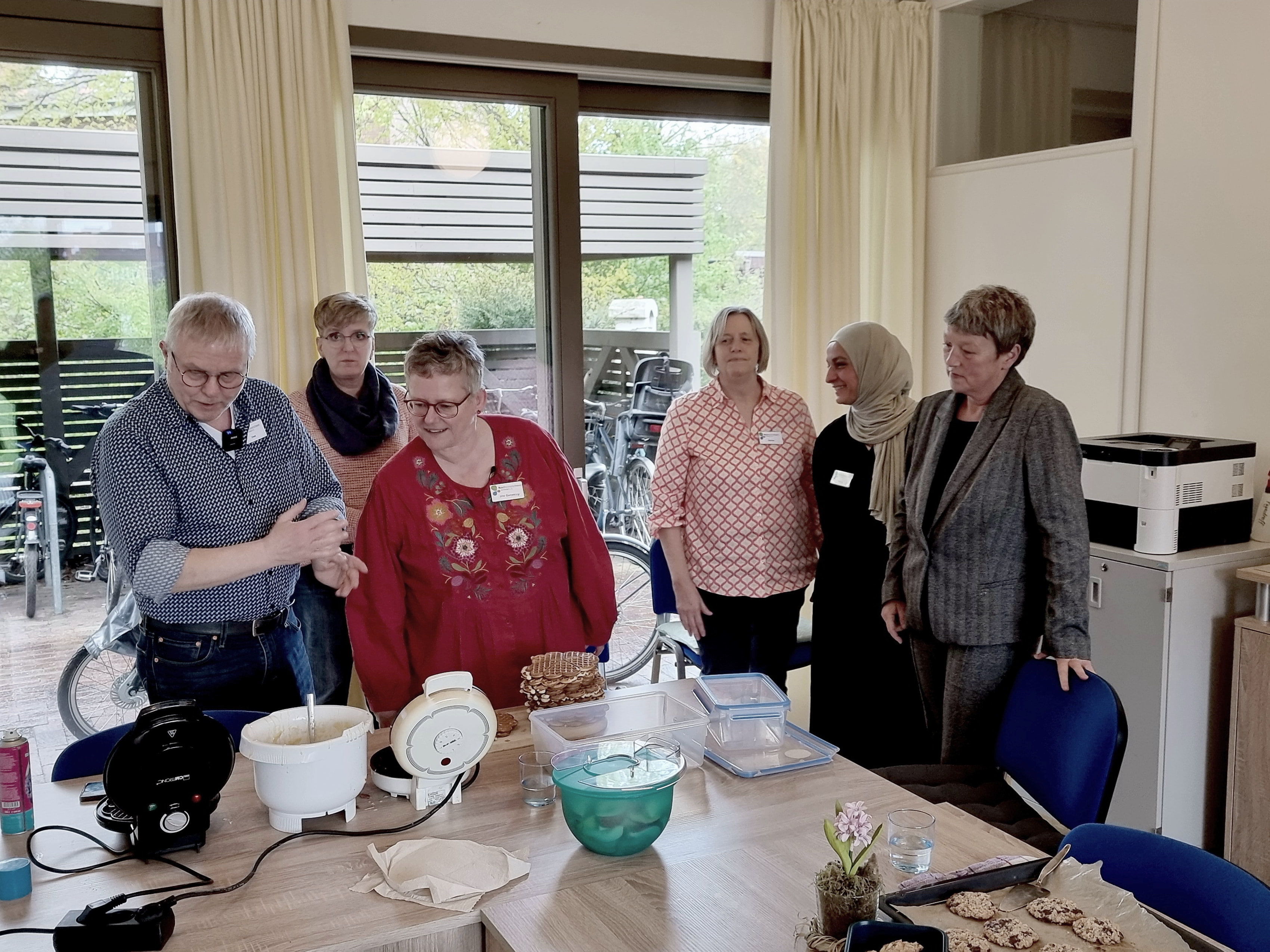 Danach ging es durch den Regen zu den Räumen der Dammermann-Haunschild-Stiftung, um unsere Kochgruppe zu besuchen. Es wurden leckere Waffeln, vegane Kekse und köstlicher Rhabarberkäsekuchen gebacken. In dieser Kochgruppe treffen sich einmal im Monat ca. 10 Personen, mit und ohne Behinderung, mit und ohne Migrationshintergrund, und kochen und essen gemeinsam. Auch das ist eine gute Möglichkeit, um mit Nachbarn in Kontakt zu kommen. Nichts verbindet mehr, als Köstlichkeiten aus Nachbars Töpfen gemeinsam zu essen.